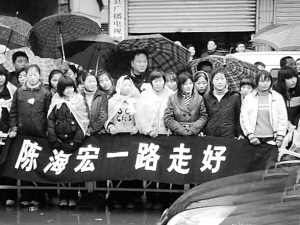 濤聲:2009年3月12日早晨,天空下著雨,上帝為失去一位好檢察官而哭泣!這天是鄲城人民的好兒子陳海宏出殯的日子!早晨8點(diǎn)20左右靈車駛?cè)胄氯A路。路兩邊站滿了送行的群眾,他們戴著白花,手拿條幅。靈車走得很慢,因為它知道海宏哥很累,好讓他多睡一會。海宏哥走好,你是鄲城的嬌傲!