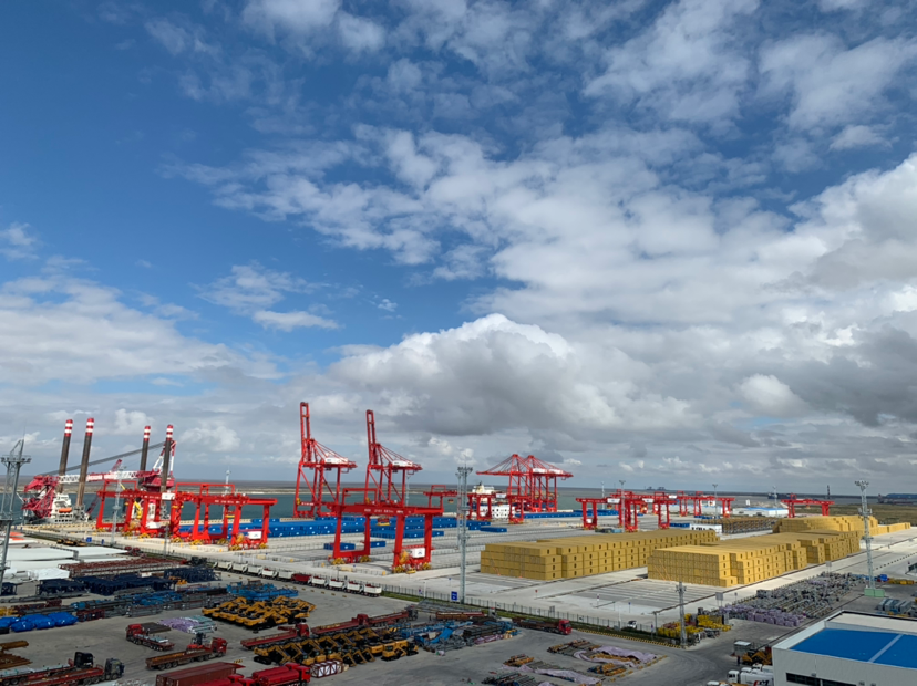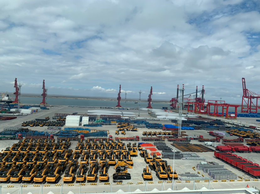 由于疫情防控的原因,記者沒能進(jìn)入港口核心區(qū),只能站在港口辦公大樓樓頂遠(yuǎn)眺港口。站在樓頂,港口景觀盡收眼底——挖掘機(jī)和風(fēng)機(jī)葉片被“碼”的整整齊齊,正待裝船出口;機(jī)器不停運轉(zhuǎn),給??康拇谎b卸貨物;重型貨柜車進(jìn)出有序、川流不息。而令人驚奇的是,諾大的港口空無一人。