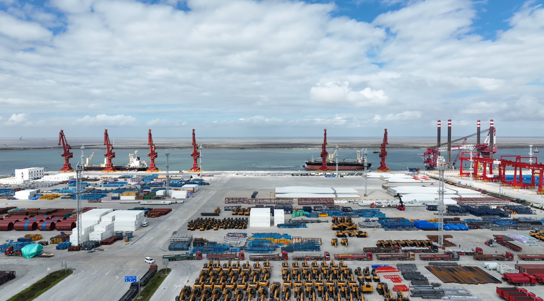 站在呂四起步港港區(qū)綜合樓的最高處,極目遠眺,港口景觀盡收眼底。港池父親般寬闊的臂膀,將一艘艘越洋而來的萬噸巨輪攬入懷中;挖掘機和風機葉片被“碼”得整整齊齊,正待裝船出口;機器不停運轉,給停靠的船只裝卸貨物;重型貨柜車進出有序、川流不息。而令人驚奇的是,偌大的港口幾乎沒有看到一個工作人員。