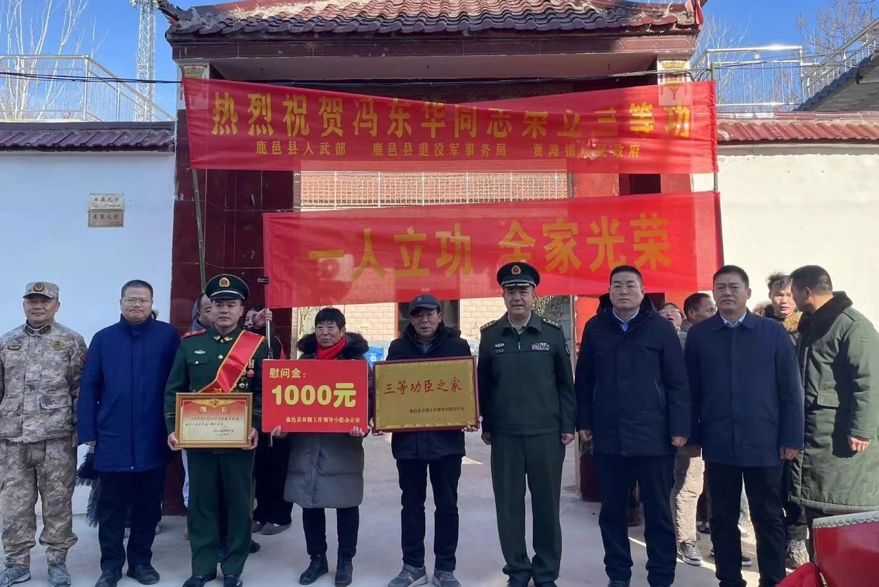 喜報(bào)傳佳音,榮耀滿門庭。為進(jìn)一步弘揚(yáng)新時(shí)代擁軍優(yōu)屬光榮傳統(tǒng),增強(qiáng)軍人榮譽(yù)感和軍屬自豪感,1月22日,鹿邑縣人武部領(lǐng)導(dǎo)帶領(lǐng)縣人武部、縣退役軍人事務(wù)局及賈灘鎮(zhèn)黨委政府相關(guān)負(fù)責(zé)同志及現(xiàn)役軍人所在部隊(duì)代表一行人,敲鑼打鼓來到榮立三等功的現(xiàn)役軍人馮東華同志家中,送上立功喜報(bào)和慰問品,向立功軍人及家屬表達(dá)親切的關(guān)懷和衷心的祝賀。