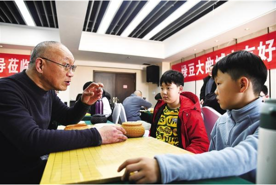 11月22日上午,一位老棋手同時(shí)對弈兩個(gè)娃娃棋手,幫助娃娃們提高棋藝。當(dāng)日,在河南省圍棋協(xié)會(huì)的支持下,由周口市圍棋協(xié)會(huì)主辦的“鄭州、南陽、周口三市圍棋交流賽”在周口舉行。